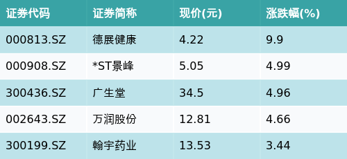 截止收盘云开体育,仿制药一致性评价主题涨跌幅最高的五只股票为:德展健康(000813.SZ)、*ST景峰(000908.SZ)、广生堂(300436.SZ)、万润股份(002643.SZ)与翰宇药业(300199.SZ)。细目见下表: