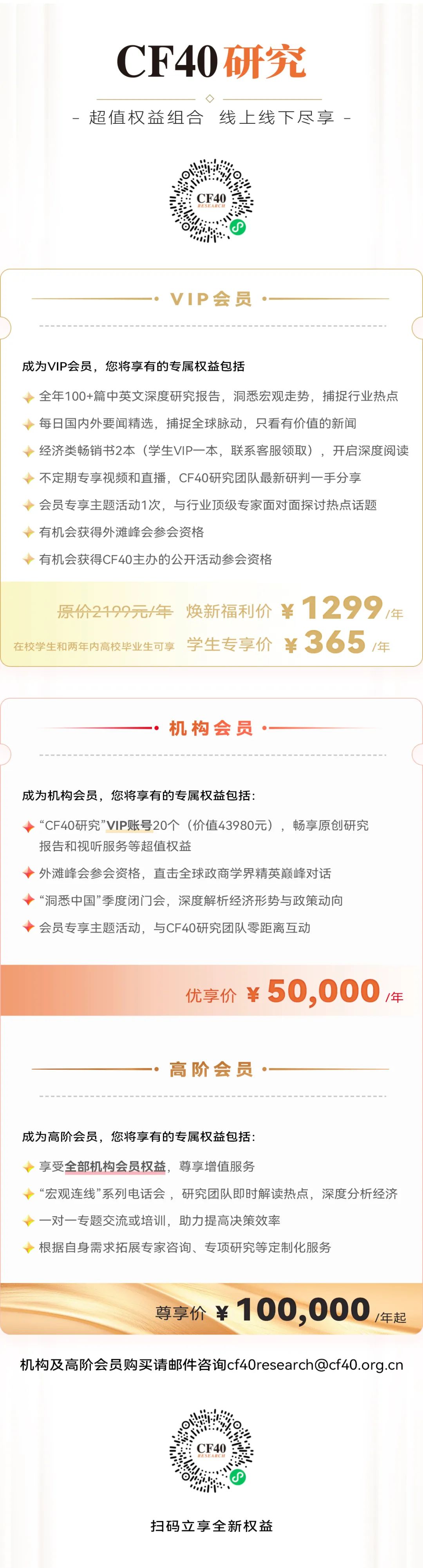 咱们的原创盘算居品序列“CF40不雅察”现全新升级为“CF40盘算”,并已在微信小要津规定式上线。订阅“CF40盘算”,您将畅享全年无拒绝原创文书奉送、专属视频和直播、极品史籍赠阅、会员专享主题举止、有契机参加CF40主持举止等线上线下超值权柄组合。