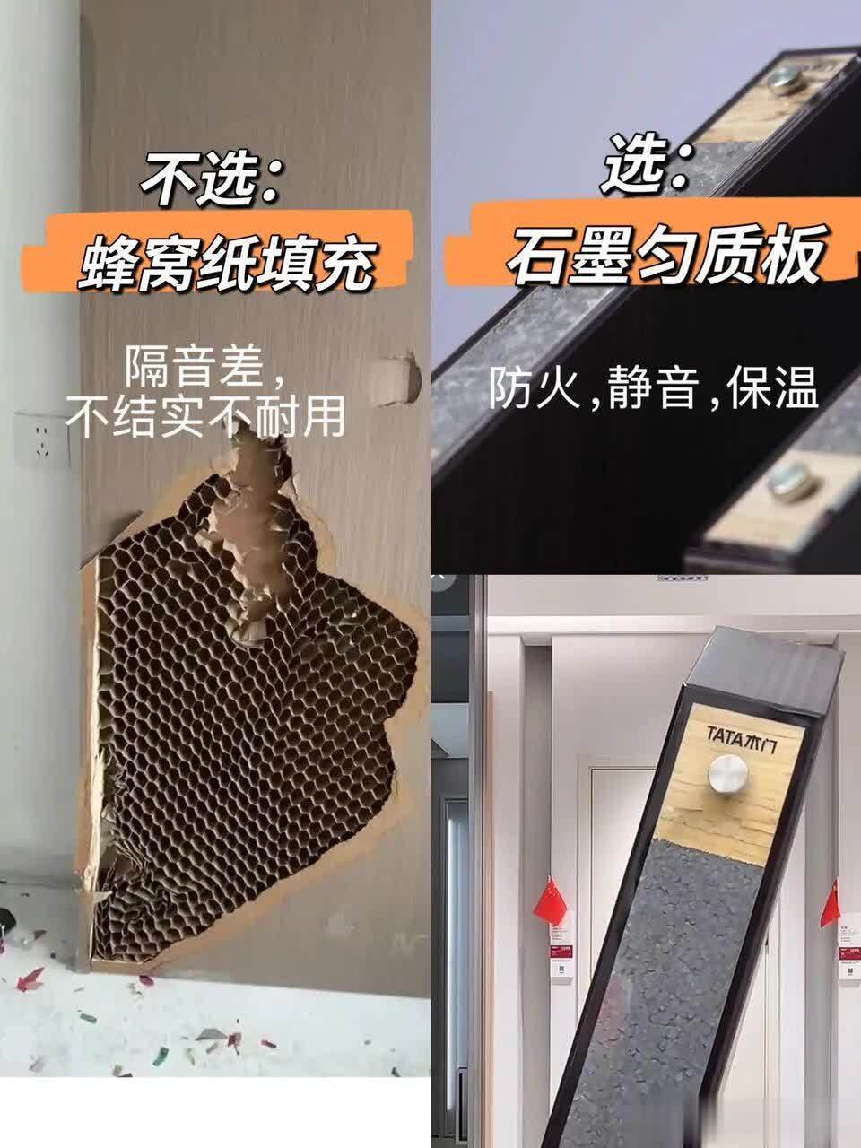 3. 不选蜂窝纸填充,选石墨匀质板蜂窝纸填充的门等于“纸糊的”,不结子不耐用,隔音更是拉胯;石墨匀质板填充的门,防火、静音、保温全占了,卧室隐秘和得志感平直拉满。