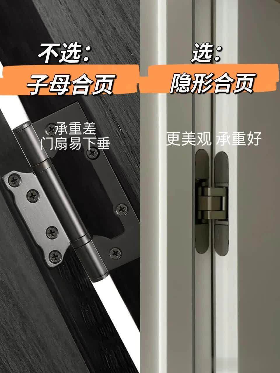 5. 不选母子合页,选隐形合页母子合页承重能力差,用真切门扇就容易下垂,门齐关不严;隐形合页不仅颜值高,和门体如胶如漆更好意思不雅,承重能力还强,用好几年齐不会坏。