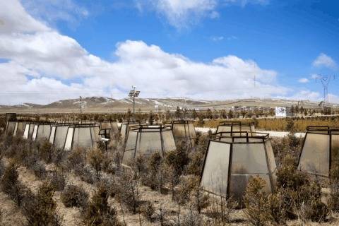这是2026年3月18日拍摄的用于保护树苗的顶开式滤光温室和PE树围。新华社记者 周昱龙 摄历经20余年攻坚克难