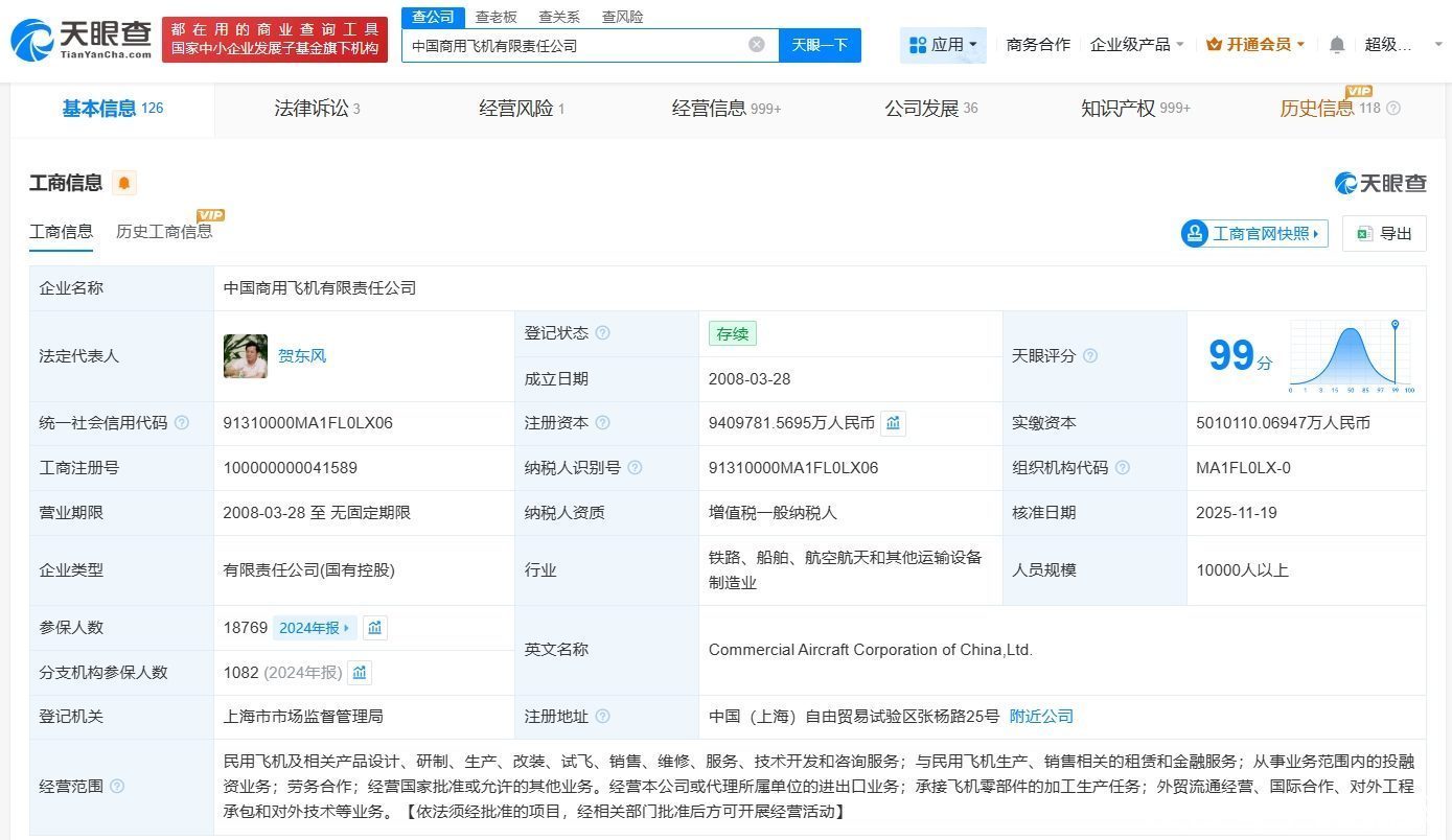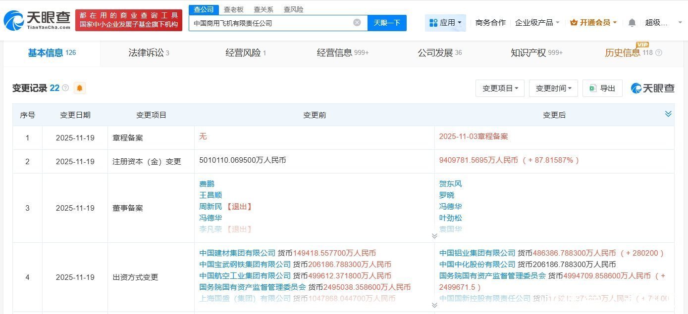 天眼查App深远,近日,中国商用飞机有限牵扯公司发生工商变更开云体育,注册成本由约501.01亿东说念主民币增至约940.98亿东说念主民币,增幅约88%。