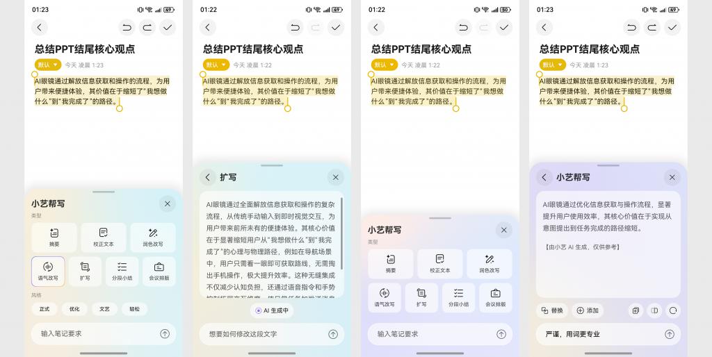 除了润色扩写,还有口吻改写,你不错使用小艺帮写为选中的文本诊疗措辞和口吻(共厚爱、优化、文艺、纵欲四种),让文本变得愈加妥帖。