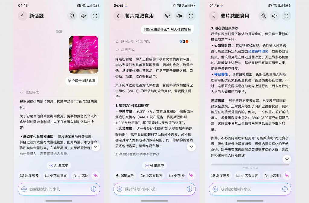 在超市购物时,在食物配料表中看到了不熟悉的添加剂,只需拍张像片发给小艺问答,小艺就约略径直、澄澈地告诉你,这个添加剂的作用是什么、提议摄入量是些许,让你不必再因看不懂添加剂而险恶。
